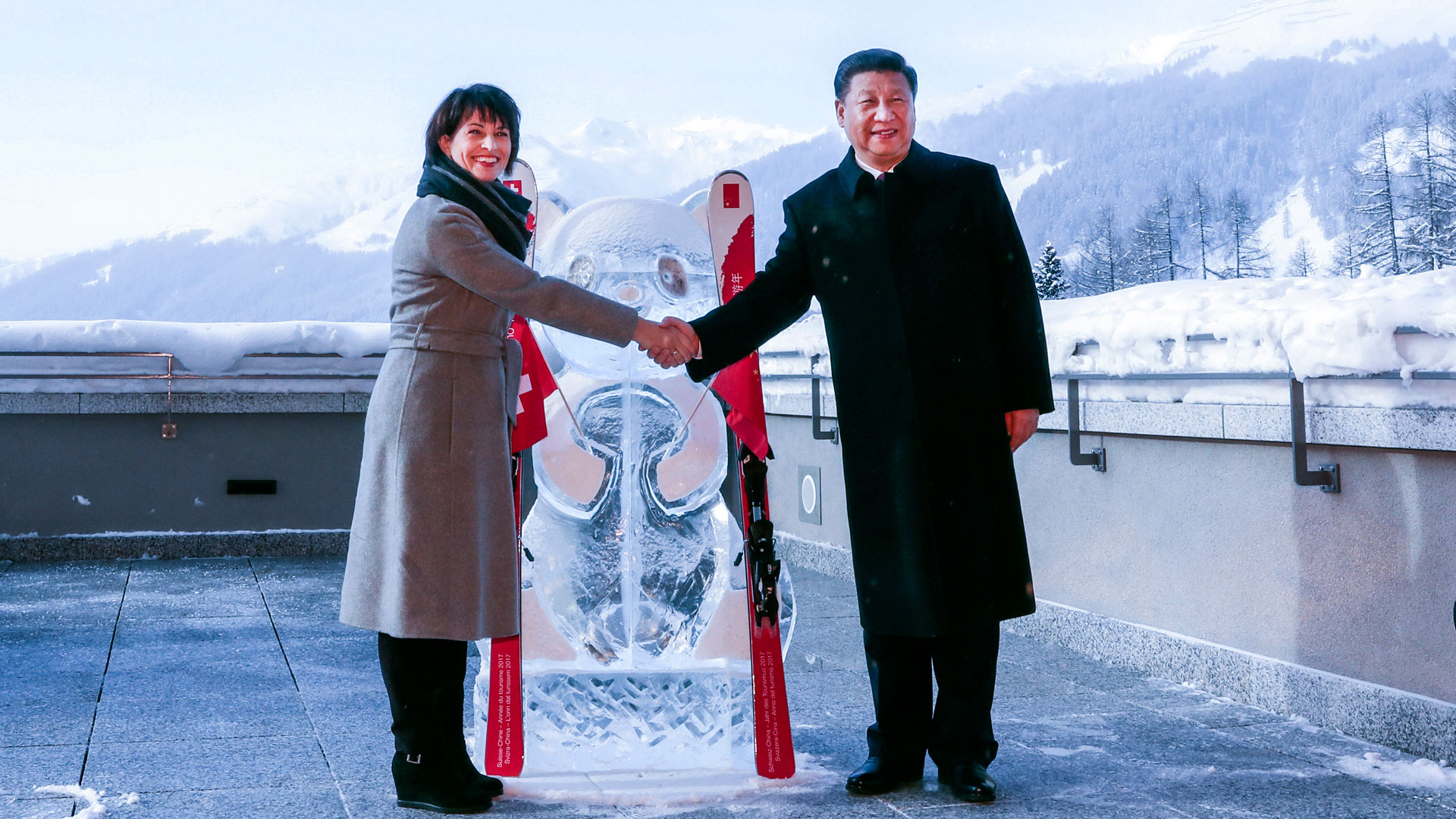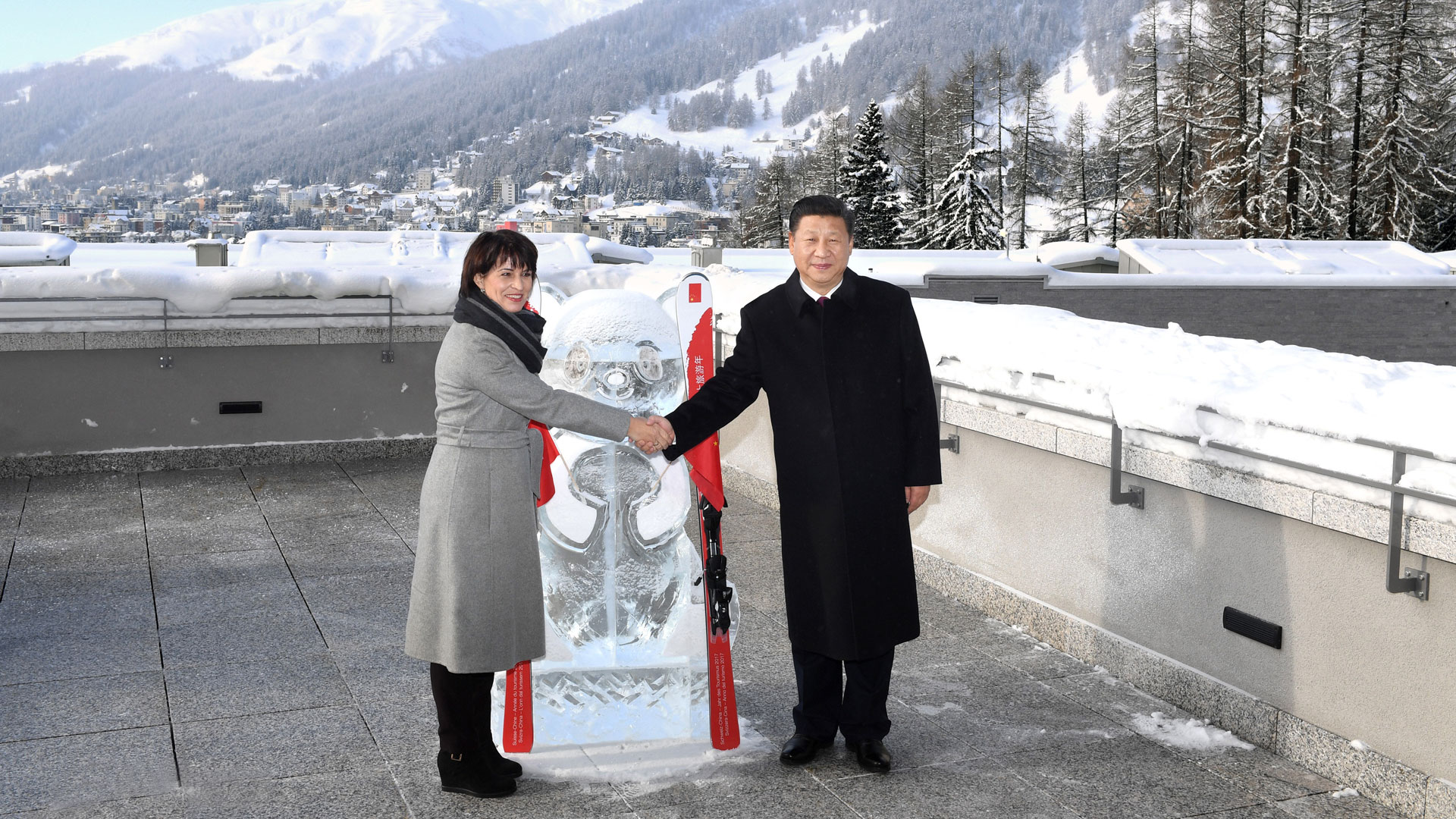 1月17日,國家主席習(xí)近平同瑞士聯(lián)邦主席洛伊特哈德在達(dá)沃斯共同啟動中瑞旅游年。兩國元首在熊貓冰雕像和印有中瑞兩國國旗及“中瑞旅游年”字樣的滑雪板旁合影留念。新華社記者 饒愛民 攝2017-01-18