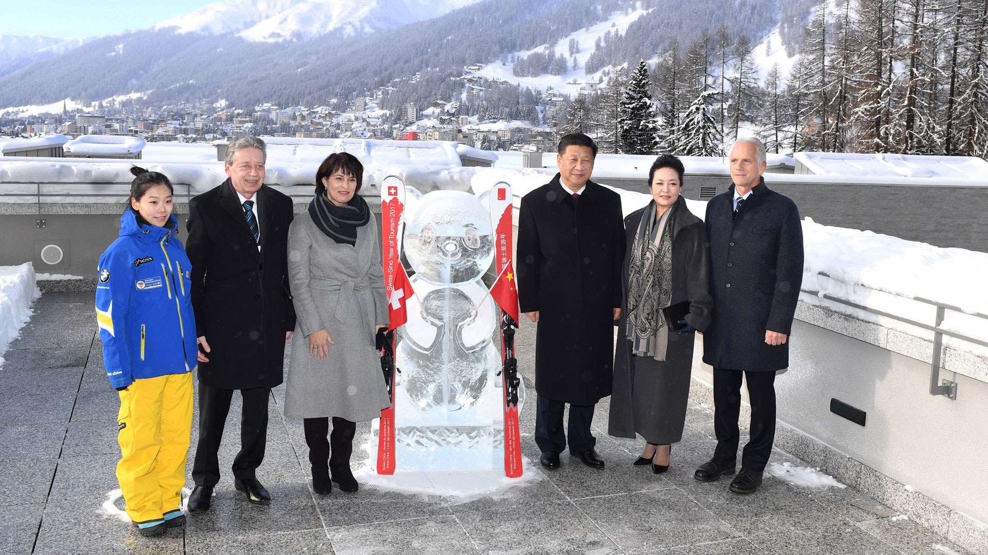 1月17日,國家主席習(xí)近平同瑞士聯(lián)邦主席洛伊特哈德在達(dá)沃斯共同啟動中瑞旅游年。兩國元首夫婦等在熊貓冰雕像和印有中瑞兩國國旗及“中瑞旅游年”字樣的滑雪板旁合影留念。新華社記者 饒愛民 攝2017-01-18