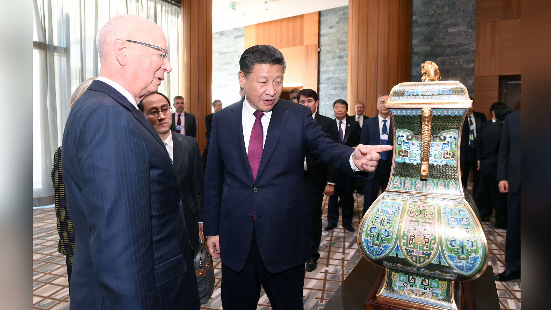1月17日,國家主席習(xí)近平在瑞士達(dá)沃斯會見世界經(jīng)濟(jì)論壇主席施瓦布。這是習(xí)近平向施瓦布介紹中華人民共和國贈送給世界經(jīng)濟(jì)論壇的四面方尊。新華社記者 饒愛民 攝2017-01-18