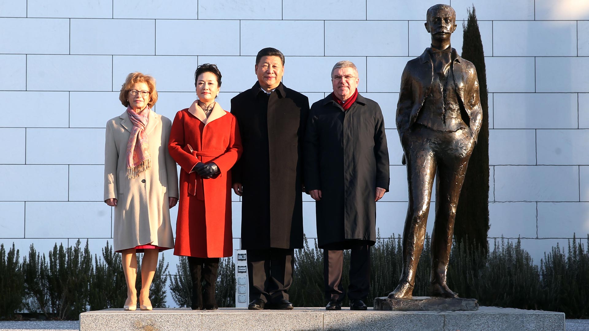 1月18日,國家主席習(xí)近平在瑞士洛桑國際奧林匹克博物館會見國際奧林匹克委員會主席巴赫。這是習(xí)近平和夫人彭麗媛與巴赫夫婦在現(xiàn)代奧林匹克運(yùn)動發(fā)起人顧拜旦雕像前合影。新華社記者 姚大偉 攝2017-01-19