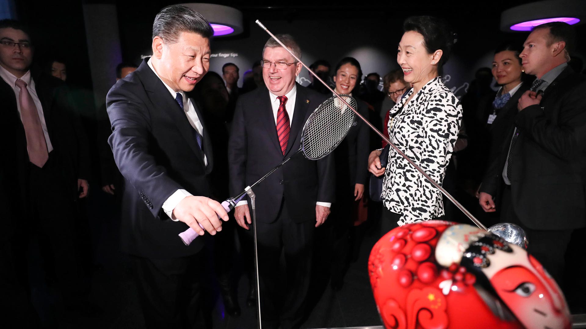 1月18日,國家主席習(xí)近平在瑞士洛桑國際奧林匹克博物館會見國際奧林匹克委員會主席巴赫。這是習(xí)近平在巴赫陪同下,參觀羽毛球世界冠軍李玲蔚用過的球拍。新華社記者 蘭紅光 攝2017-01-19