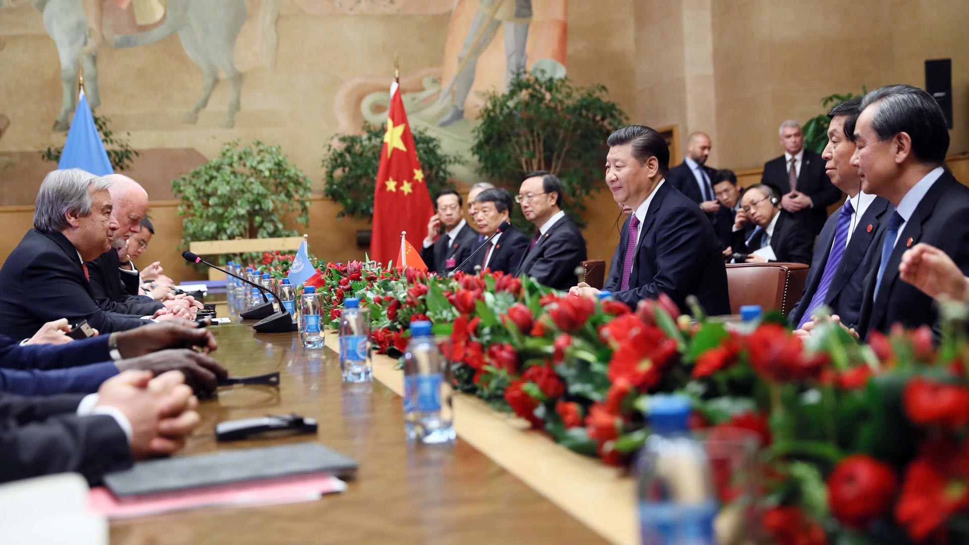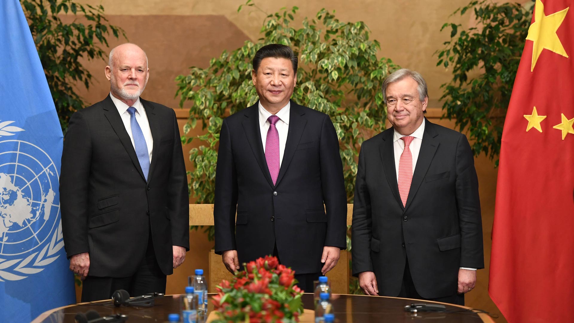 1月18日,國家主席習(xí)近平在瑞士日內(nèi)瓦萬國宮會見第71屆聯(lián)合國大會主席湯姆森和聯(lián)合國秘書長古特雷斯。 新華社記者 蘭紅光 攝2017-01-19