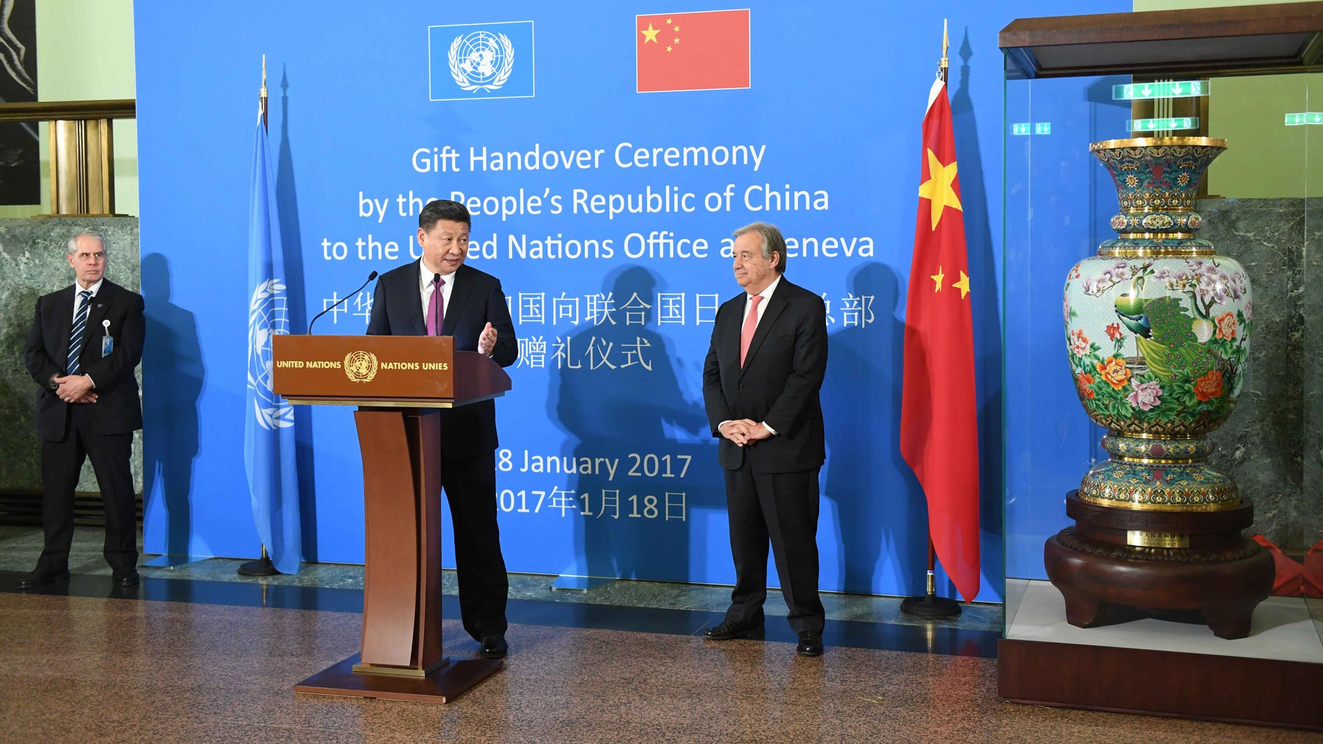 1月18日,國家主席習(xí)近平在瑞士日內(nèi)瓦萬國宮出席“共商共筑人類命運(yùn)共同體”高級別會議,并發(fā)表題為《共同構(gòu)建人類命運(yùn)共同體》的主旨演講。這是會議結(jié)束后,習(xí)近平出席中國向聯(lián)合國日內(nèi)瓦總部贈禮儀式。新華社記者 張鐸 攝2017-01-19
