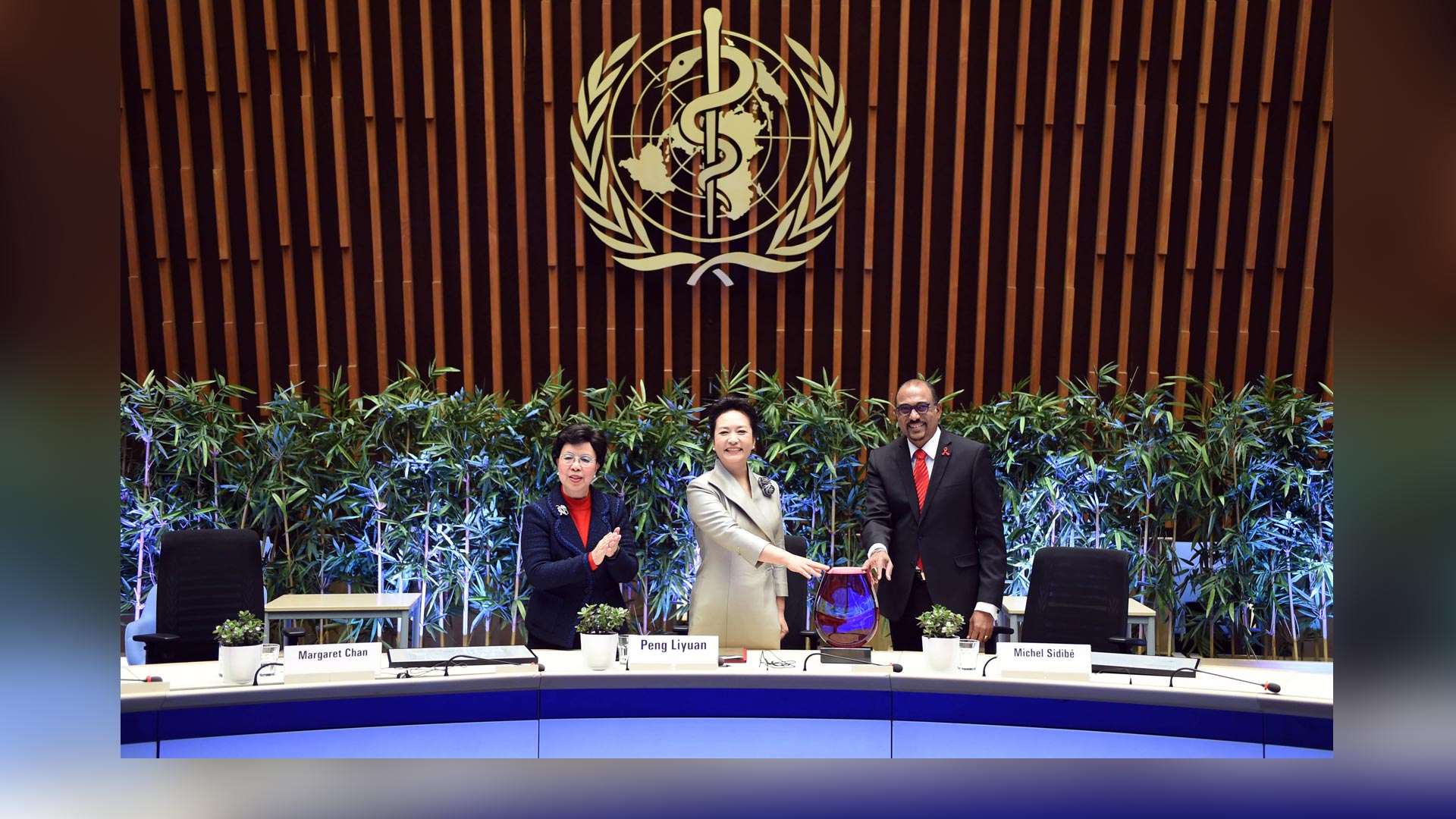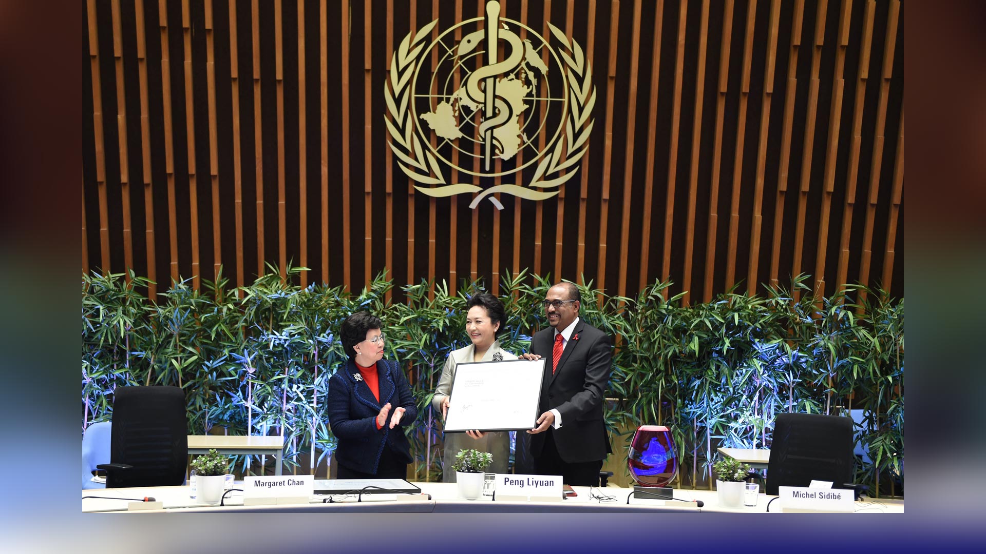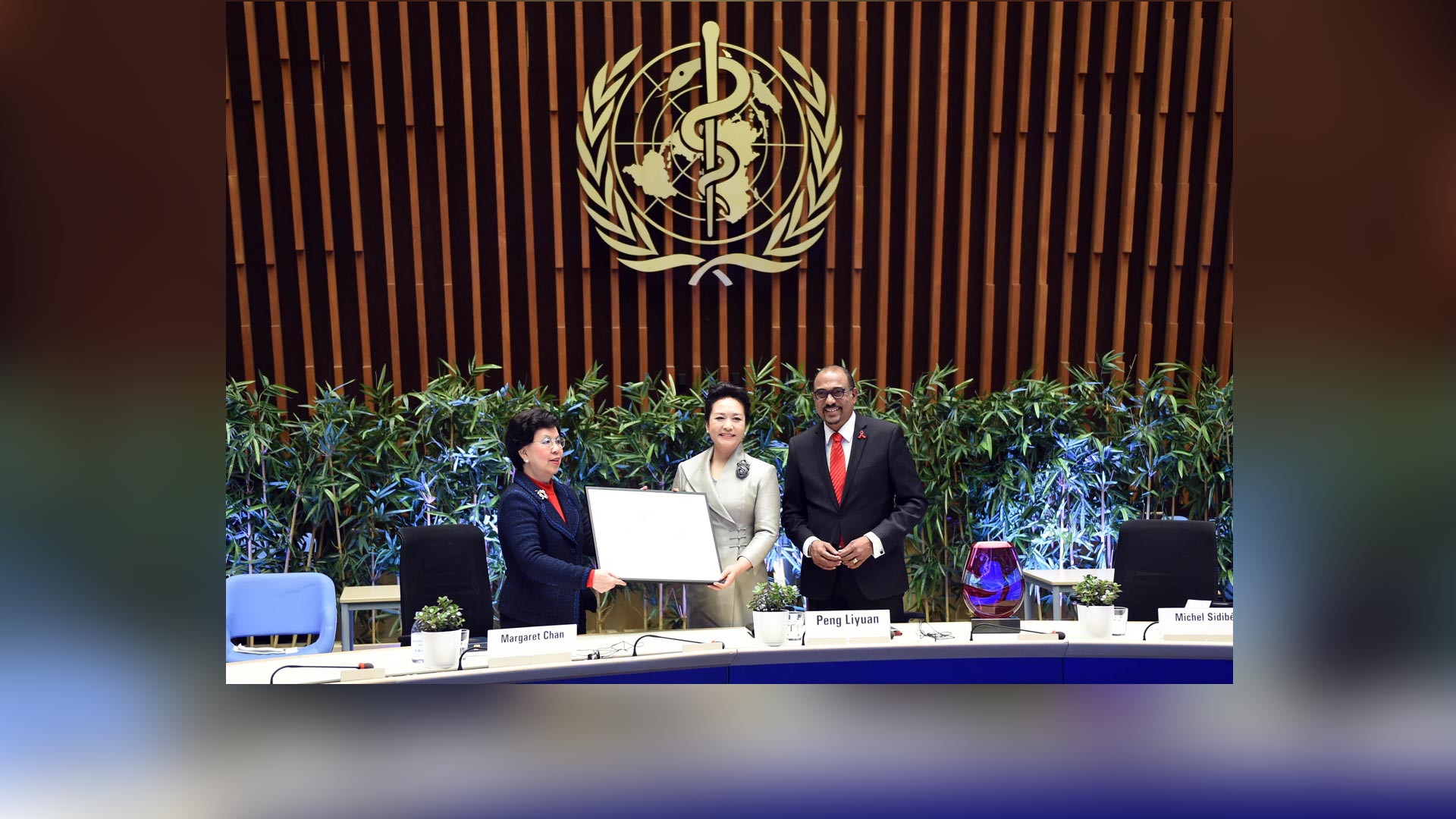 1月18日,國家主席習(xí)近平夫人、世界衛(wèi)生組織結(jié)核病和艾滋病防治親善大使彭麗媛應(yīng)世界衛(wèi)生組織總干事陳馮富珍和聯(lián)合國艾滋病規(guī)劃署執(zhí)行主任西迪貝邀請,在瑞士日內(nèi)瓦出席為她舉行的親善大使任期續(xù)延暨頒獎儀式。這是世界衛(wèi)生組織總干事陳馮富珍向彭麗媛頒發(fā)世衛(wèi)組織榮譽(yù)勛章。新華社記者謝環(huán)馳攝2017-01-19