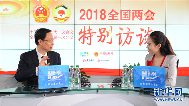 3月14日,全國(guó)人大代表、南京市市長(zhǎng)藍(lán)紹敏(左)做客新華網(wǎng)2018全國(guó)兩會(huì)特別訪談。新華網(wǎng) 楊濛攝