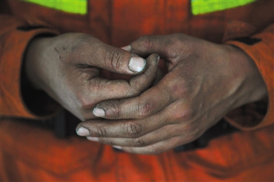 昨日下午,從火場返回駐地的消防員胡顯祿,雙手還是被煙火熏黑的顏色。記者 吳江