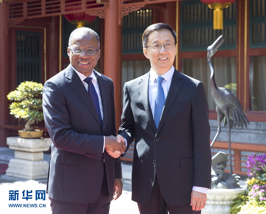 9月6日,中共中央政治局常委、國務院副總理韓正在北京釣魚臺國賓館會見佛得角總理席爾瓦。 新華社記者 王曄 攝