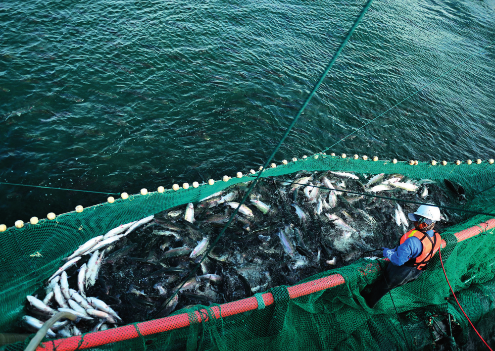 龙洋知鲜(青海)股份有限公司员工给冷水鱼降温。龙羊峡库区位于青海省海南藏族自治州,优质的水资源和优越的生态环境造就了当地的冷水鱼生产优势(2024年10月18日摄)张龙摄/本刊