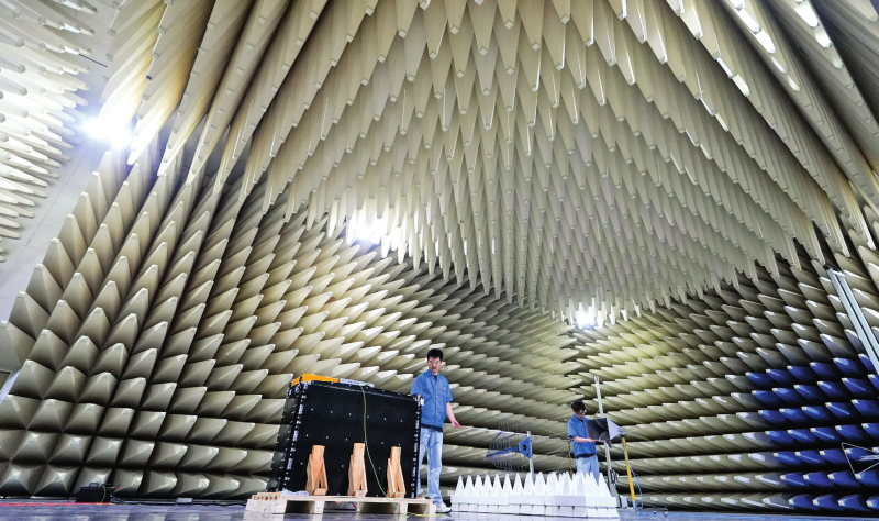 在位于江苏省常州市武进区的新誉集团有限公司电磁兼容实验室,工作人员在进行设备调试(2024年6月14日摄)李博摄/本刊
