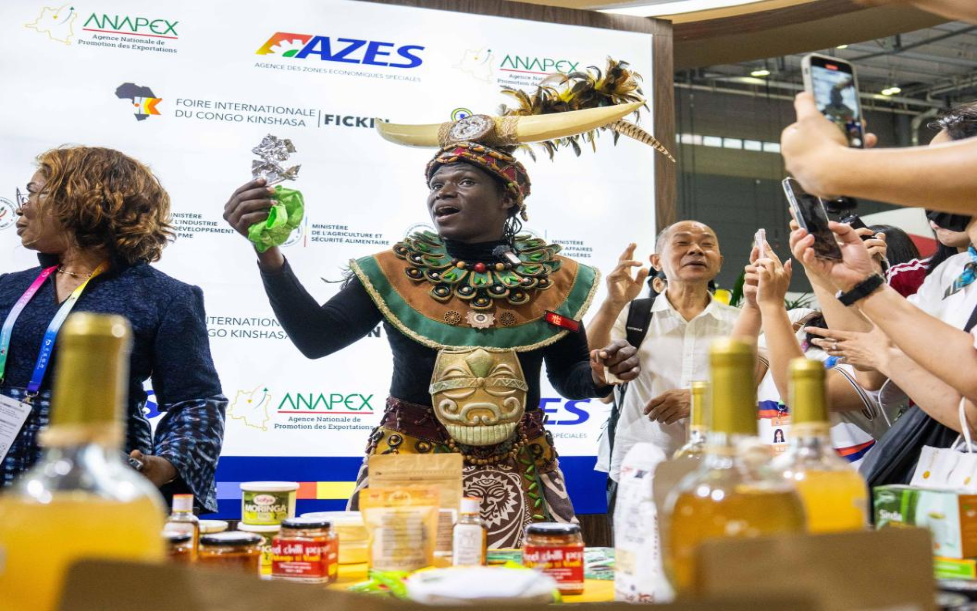 6月13日,在长沙国际会展中心,参展商(左二)向观众介绍非洲商品。 新华社记者 陈思汗 摄