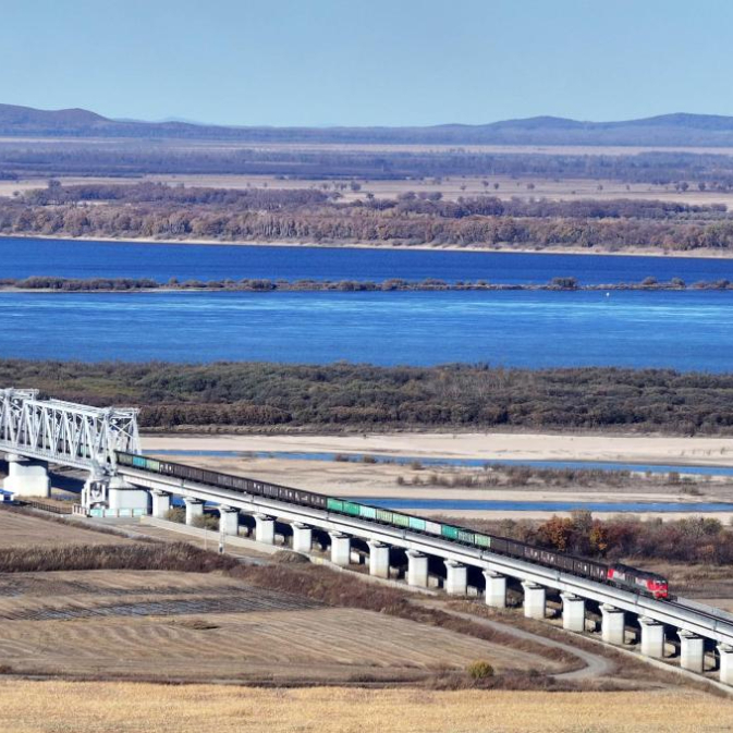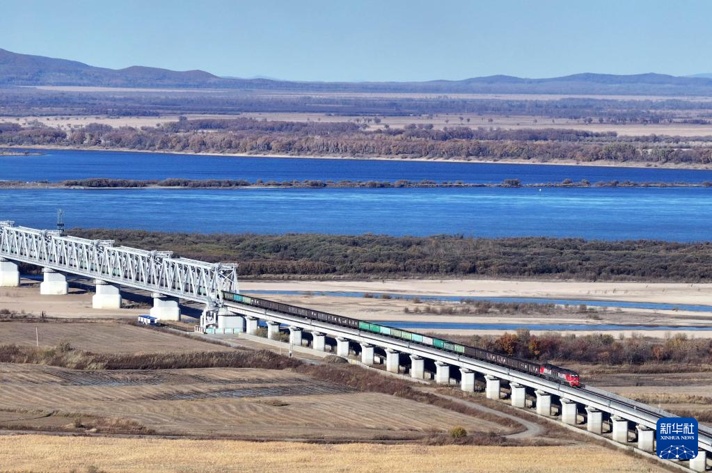 10月16日,满载进口物资的货物列车通过同江铁路大桥驶向中国铁路哈尔滨局集团有限公司同江北站(无人机照片)。
