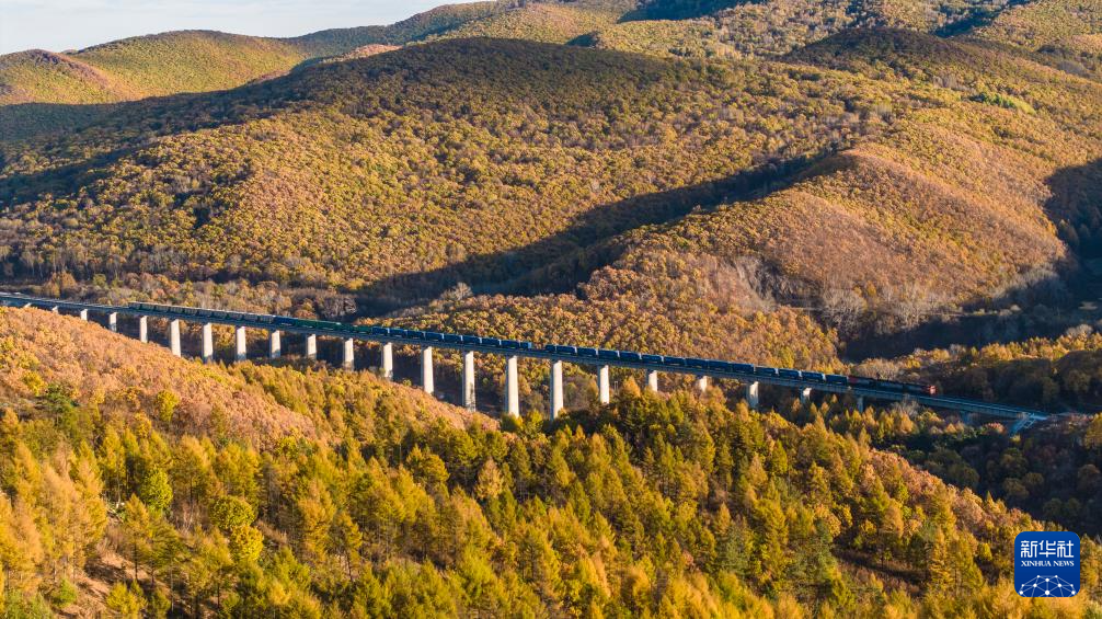 10月16日,满载进口物资的货物列车驶向中国铁路哈尔滨局集团有限公司同江北站(无人机照片)。