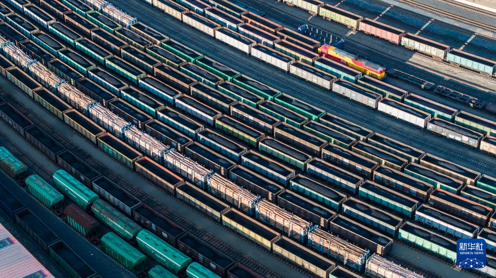 10月18日,在中国铁路哈尔滨局集团有限公司绥芬河站南场,满载进口货物的列车等待解体换装(无人机照片)。