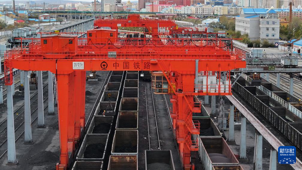 10月18日,在中国铁路哈尔滨局集团有限公司满洲里站,机械化换装场在对进口货物进行换装作业(无人机照片)。
