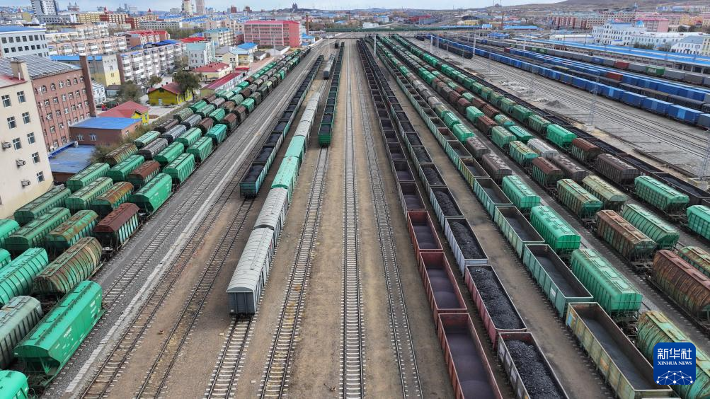 10月18日,在中国铁路哈尔滨局集团有限公司满洲里站编组场,中欧班列及进口货物列车在等待取送车作业(无人机照片)。