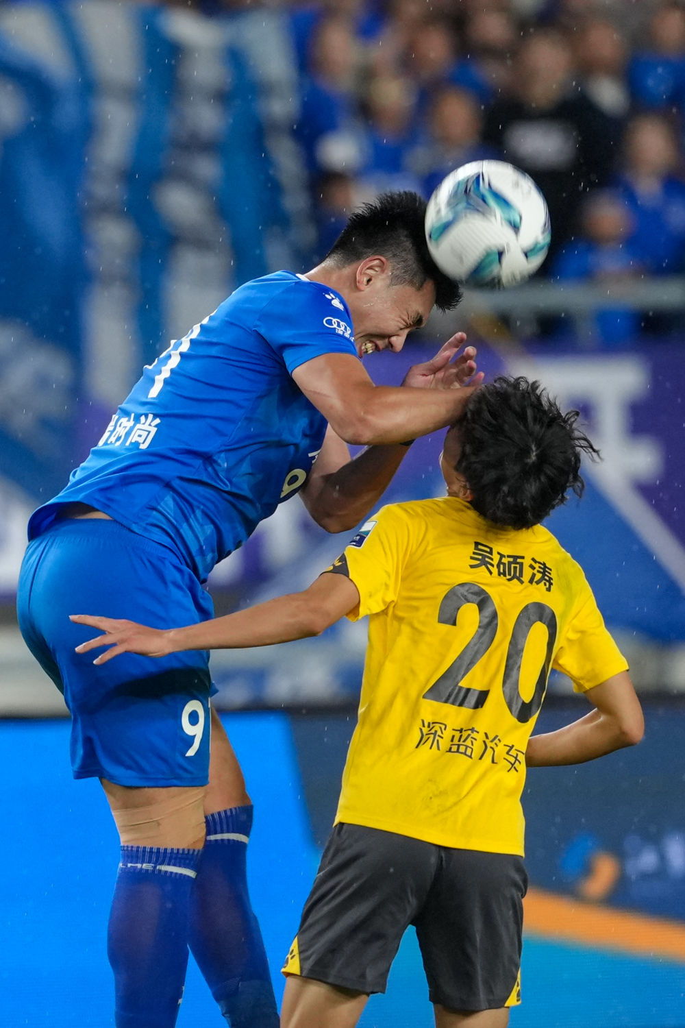 10月18日,南京队球员冯伯元(左)在比赛中争顶头球。新华社记者 李博 摄