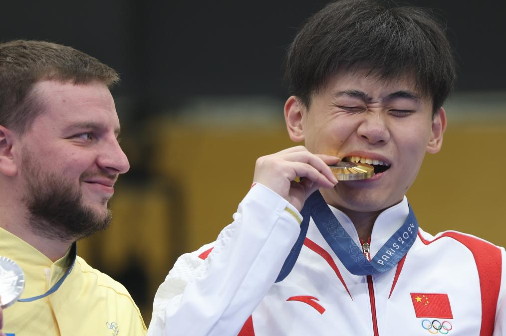 2024年8月1日,冠军中国选手刘宇坤(右)在巴黎奥运会射击男子50米步枪三姿颁奖仪式上咬金牌庆祝。新华社记者 赵丁喆 摄