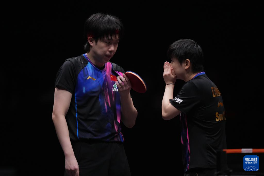 12月13日,王楚钦/孙颖莎(右)在比赛中商讨战术。