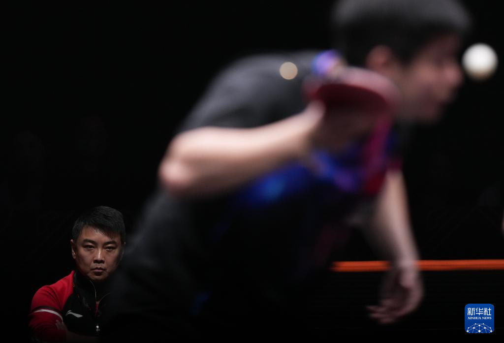 12月14日,教练王皓(左)在场边观看林诗栋比赛中。
