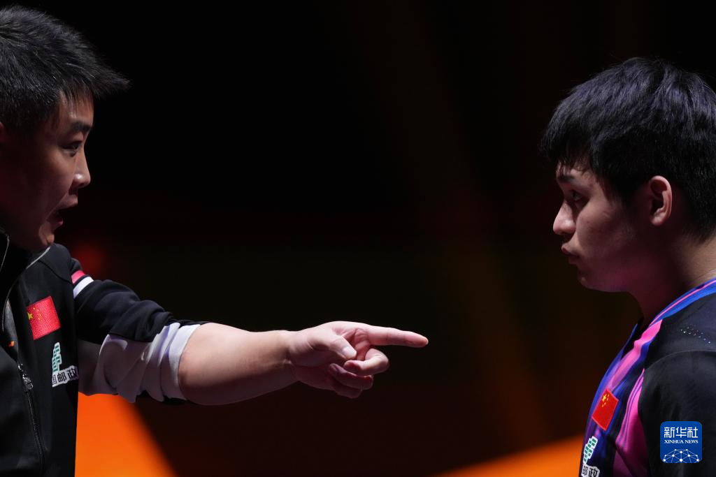 12月14日,教练王皓(左)在比赛间隙指导林诗栋。