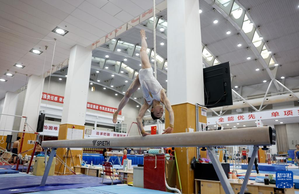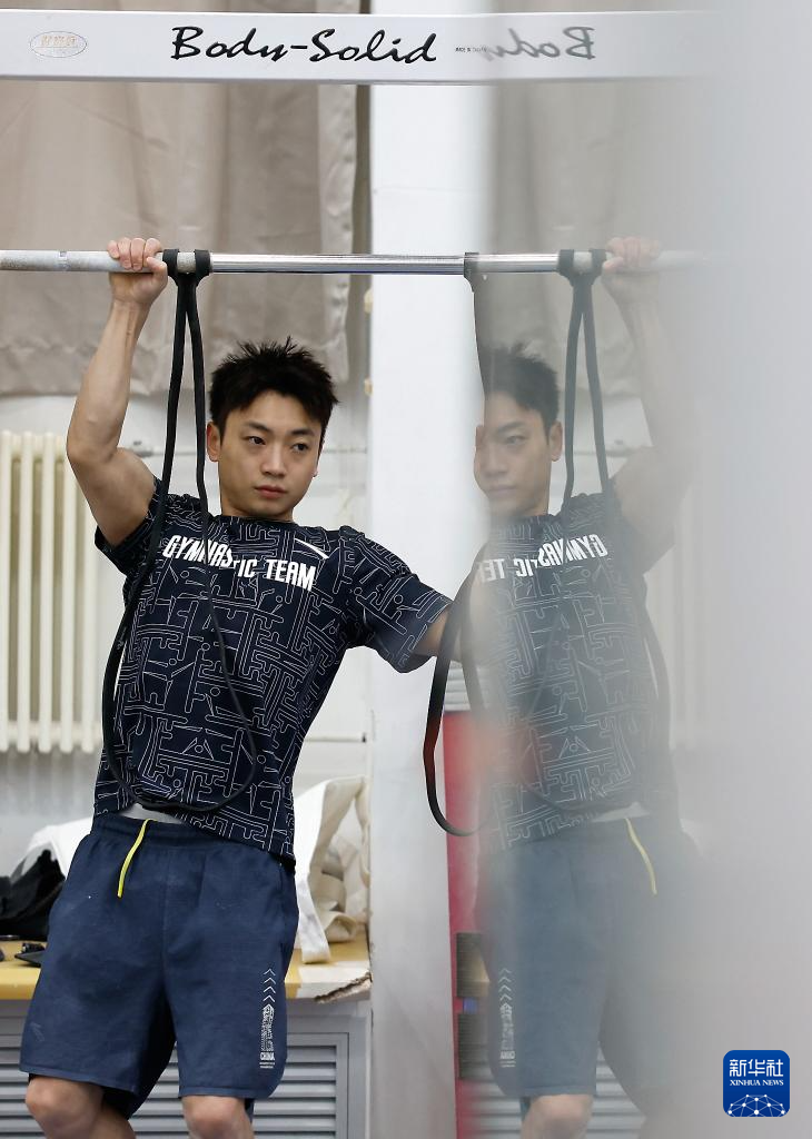 1月31日,张博恒在双杠训练中。