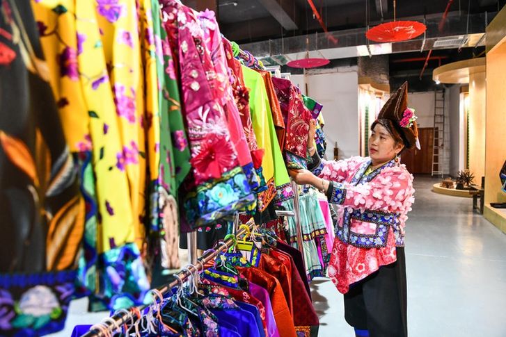 看到我們的生意越做越火,村里更多的姐妹也想加入進(jìn)來,于是,我在2014年成立了民族刺繡專業(yè)合作社,組織大家一起生產(chǎn)。人多了、機(jī)器多了、創(chuàng)意也多了。我們把苗繡元素與現(xiàn)代服飾相結(jié)合,把不同大小、圖案的繡片點(diǎn)綴縫制在背包、衣服、鞋子上,讓消費(fèi)者無論逛街還是上班都能穿,很受市場歡迎。