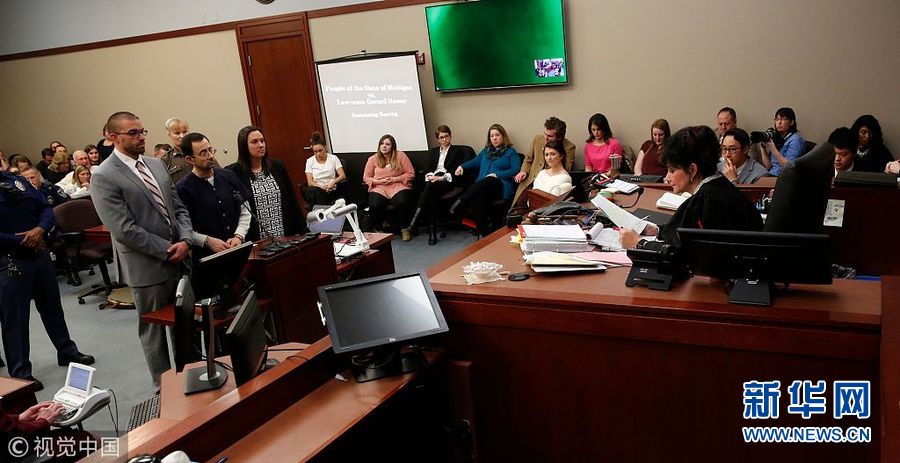 1月24日,美國密歇根州蘭辛,美國奧運體操隊前隊醫(yī)拉里·納沙因性侵被判處40-175年監(jiān)禁。過去7天,超過150名女性向法官證實,自己曾是納沙的性侵對象,其中包括多名兒童。在法院宣讀的一份聲明中,納沙表示自己對受害者的歉意已“超出言語的表達(dá)范圍”。54歲的納沙1996年至2015年間在美國體操協(xié)會擔(dān)任醫(yī)師。(圖片來源:視覺中國)