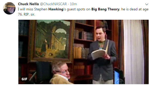 有網(wǎng)友說:“至少我們能在《生活大爆炸》中,反復(fù)看到霍金教授。” ↑