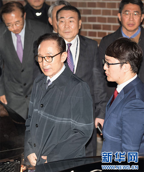 3月22日,在韓國首爾,韓國前總統(tǒng)李明博(前左)走出私宅。新華社發(fā)(李相浩 攝)