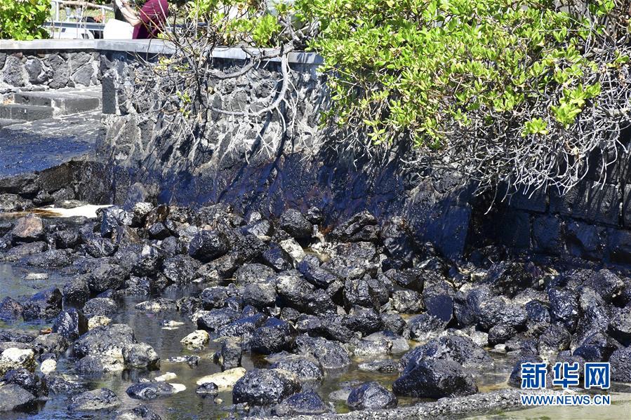 這是8月8日在毛里求斯東南部馬埃堡市拍攝的受到泄露燃油污染的海邊巖石。新華社發(fā)(戴比 攝)