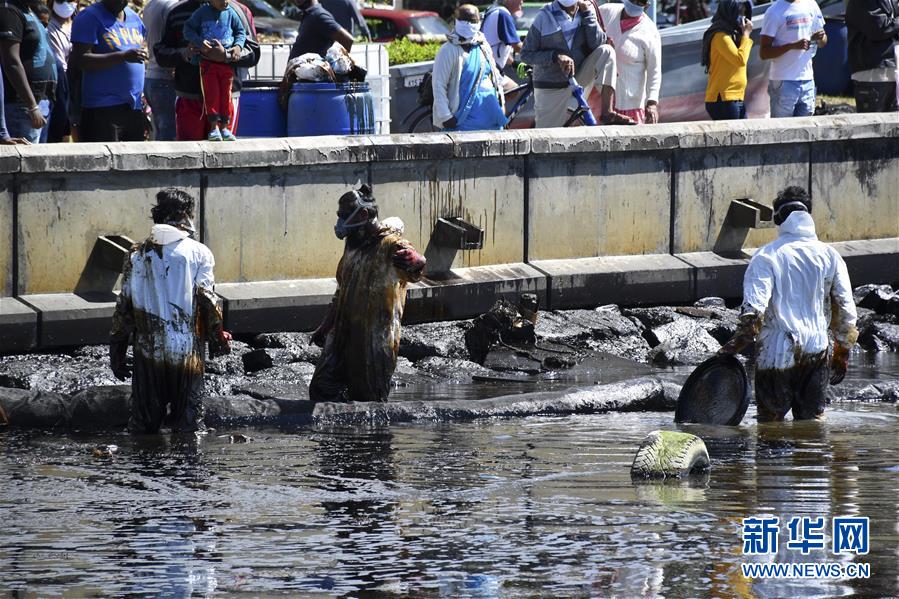 8月8日,在毛里求斯東南部的馬埃堡市,志愿者正在清除海岸邊的燃油。新華社發(fā)(戴比 攝)