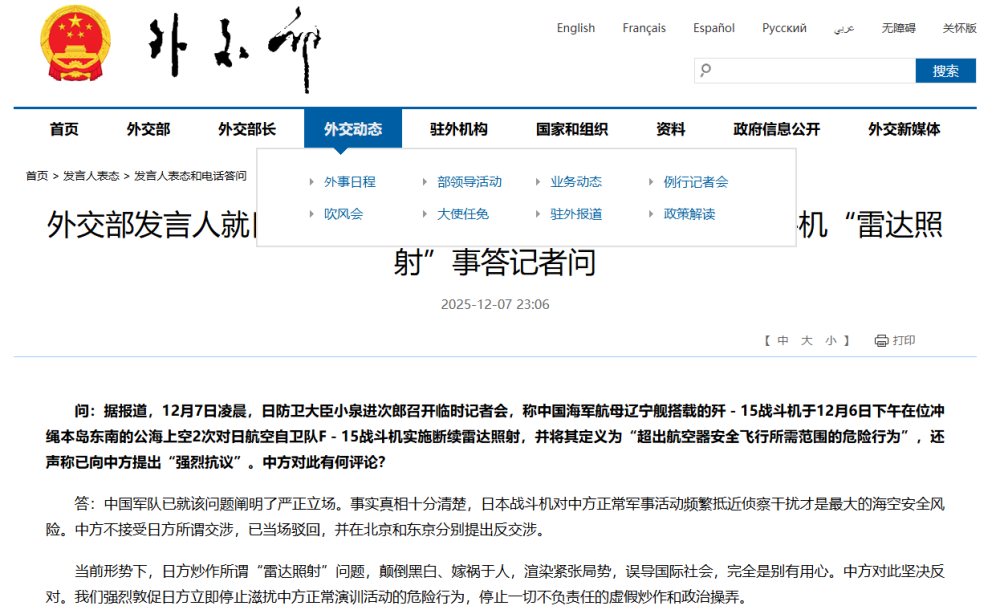 问:据报道,12月7日凌晨,日防卫大臣小泉进次郎召开临时记者会,称中国海军航母辽宁舰搭载的歼-15战斗机于12月6日下午在位冲绳本岛东南的公海上空2次对日航空自卫队F-15战斗机实施断续雷达照射,并将其定义为“超出航空器安全飞行所需范围的危险行为”,还声称已向中方提出“强烈抗议”。中方对此有何评论?